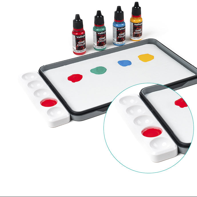 Este accesorio magnético de plástico ABS se acopla firmemente a tu paleta para ampliar tu espacio de trabajo de forma inteligente. Está diseñado para facilitar diluciones y mezclas líquidas sin saturar el papel, incluyendo además soportes integrados para mantener tus pinceles organizados y seguros.